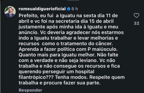 Após a declaração, Romeu Aldigueri respondeu em publicação nas redes sociais, mencionando o anúncio do investimento. “Deveria agradecer nós estarmos indo a Iguatu trabalhar e levar melhorias e recursos como o tratamento do câncer. Aprenda a fazer política com ‘P’ maiúsculo. Quanto mais para Iguatu melhor. Não falte com a verdade e não seja leviano”, escreveu.
