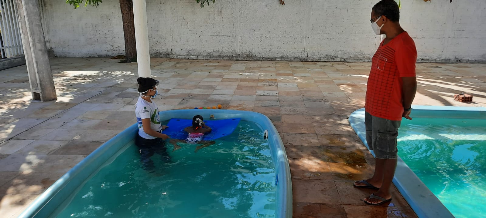 As aulas de natação também voltaram seguindo as mesmas restrições. Na piscina só um aluno por vez. Enquanto a pequena Kaunay Gonçalves, 4, participava da aula, o pai Wilker Gonçalves acompanhava de perto o desenvolvimento da menina. Os resultados são comemorados pela família. “Quando minha esposa não vem, eu venho e a gente acompanha todo o desenvolvimento dela. Somos gratos demais ao pessoal da APAE. Eles têm uma paciência muito grande, um jeito tão bom de brincar e ensinar pra essas que crianças que é de admirar. Ensina muito a gente. Em casa, a gente notou muito o bom desenvolvimento dela. Somos gratos”, comemora Wilker.
