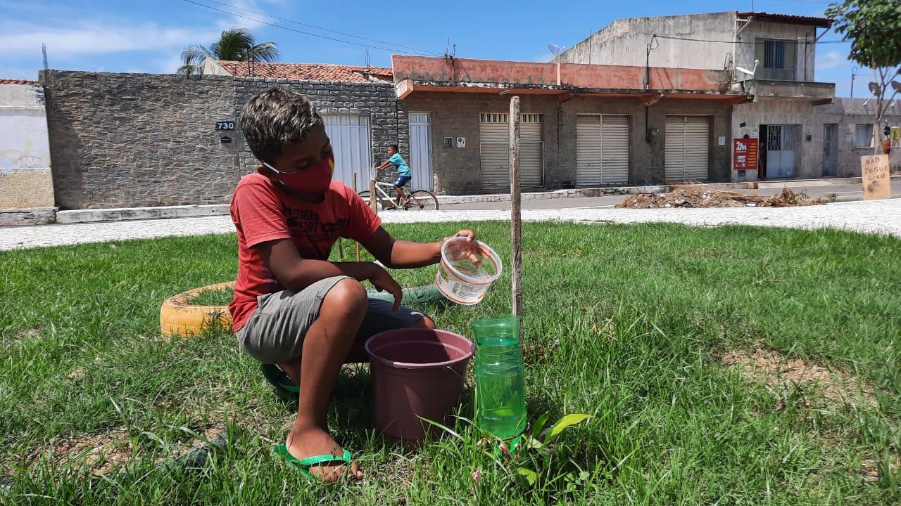 A praça que cerca a igreja do bairro não tem torneira disponível com água. Mas, Francisca Paula, Dêga, como é conhecida, é uma das moradoras que adotou um pedacinho do local, comprou até mangueira e da casa dela tira água que ajuda a manter viva e verde as plantas. “Quando eu cheguei, vi o Wemerson, que era muito pequeno, fazendo esse trabalho e me motivou porque eu gosto muito de plantas, e comecei a plantar mais ele. Tem pessoas que não respeitam, quebram. Eu e minha vizinha resolvemos fazer esse espaço para gente aproveitar a sombra para todos nós moradores. Temos que zelar por ele. Aqui é um espaço nosso”, comentou Dêga.