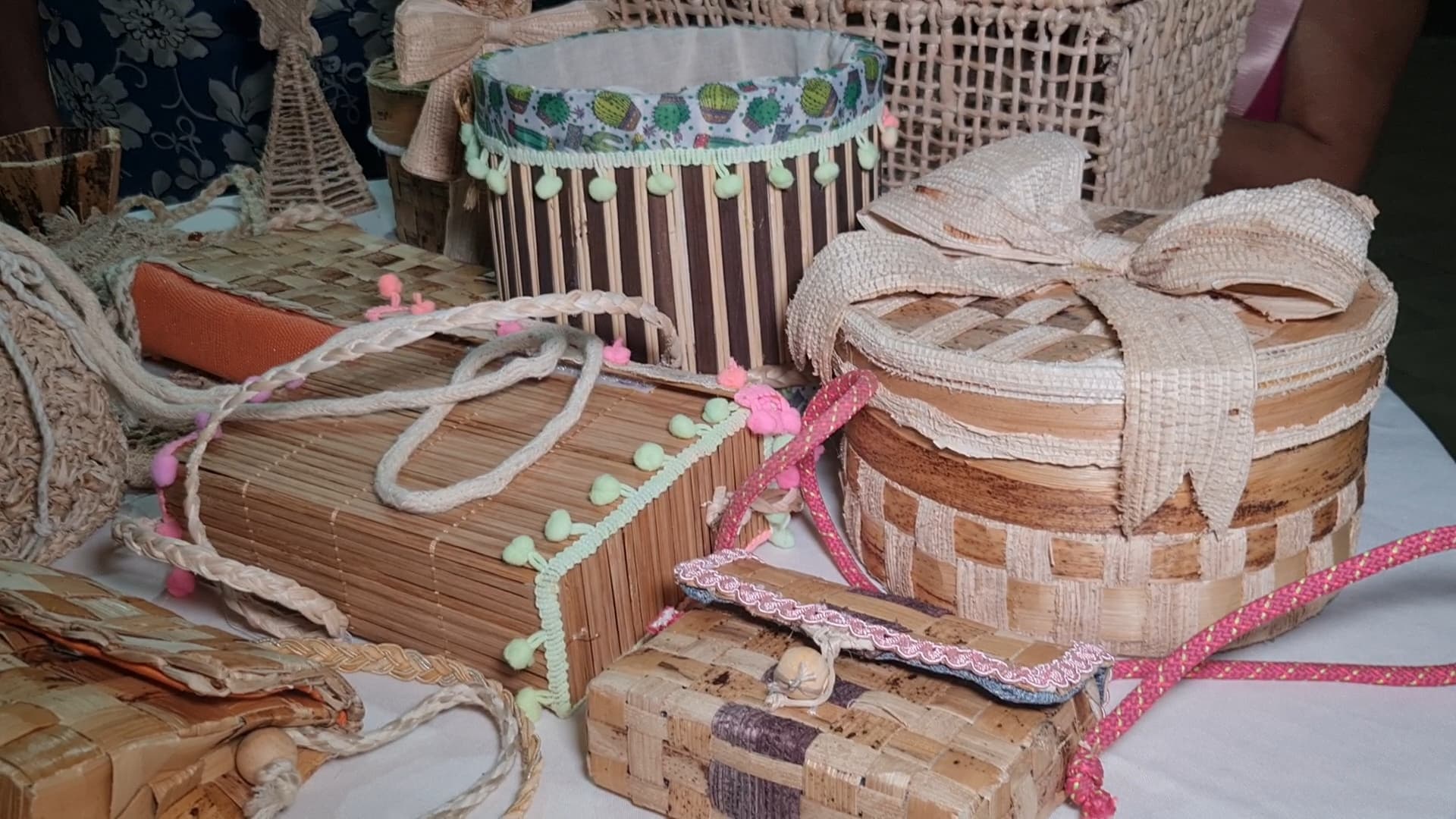 Marli Ribeiro, artesã, começou ainda na infância, quando tinha 8 anos de idade através de projetos sociais desenvolvidos pela antiga FEBEMCE. “Antigamente a prefeitura tinha em cada bairro projetos com a FEBEMCE que nos ensinavam a fazer o crochê, bordado, trabalhar com laços infantis, pintura em gesso, parafina, tinha vários projetos. Agora tô me adaptando a trabalha com a fibra da bananeira. Eu que já faço crochê passei a desenvolver essa técnica com a fibra da bananeira, não foi muito difícil até porque a técnica, que é mais trabalhoso é tirar o fio da fibra pra fazer o crochê porque não é qualquer parte da bananeira que pode ser utilizado, tem que ser um fio específico da bananeira para poder ter resistência na hora de fazer as peças”, destacou.