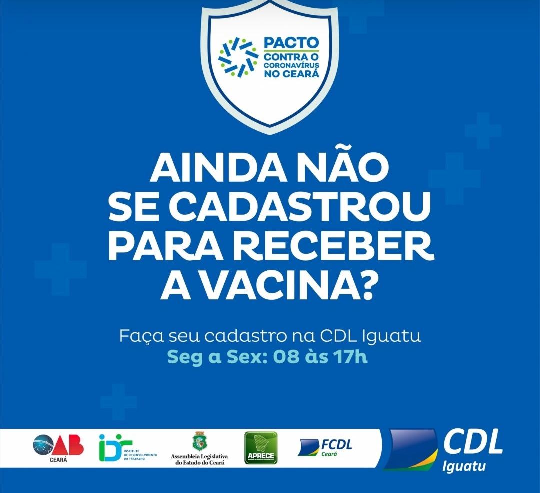 A Câmara de Dirigentes Lojistas – CDL de Iguatu segue cadastrando as pessoas que ainda não se cadastraram, para futuramente serem vacinadas. A entidade esclarece que não é responsável por vacinação. Seu papel tem sido de cooperação, na parceria com a Assembleia Legislativa do Estado, que mobilizou cerca de 18 entidades e instituições do Ceará, entre essas, as entidades do comércio, como a CDL, FCDL/CE, e outras, visando alcançar o maior número possível de pessoas, de modo a cadastrar os cidadãos para que o governo tenha em mão os dados que precisa, para saber quais os reais números dos cearenses que precisarão de vacinação contra a Covid 19.