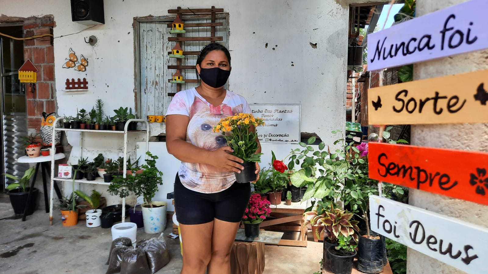 A garagem da casa de Cristiane Ricarte, no Novo Iguatu, agora está cheia de plantas. Ela está começando a vender plantas e flores, depois que o marido ficou desempregado. Cristiane que vendia balas e salgadinhos na frente de duas escolas também teve que encerrar o trabalho por conta da pandemia da Covid-19.