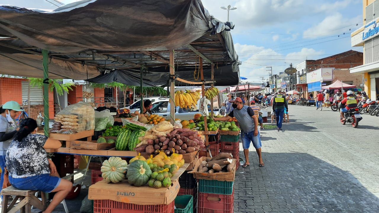 Depois de passarem mais de cinco meses sem vender nada “na rua”, isso porque as feiras livres estavam proibidas para evitar aglomerações, no centro comercial da cidade, os feirantes estão correndo “atrás do prejuízo”, mas sem descuidar das medidas necessárias de segurança. Uma das medidas adotadas é a proibição de barracas próximas umas das outras. Na Avenida Agenor Araújo, que antes era tomada por barracas, estas estão espalhadas ao longo da via nas proximidades do mercado público.