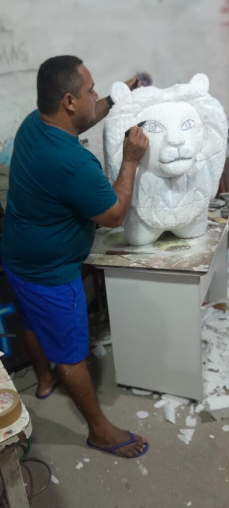 O trabalho começa do zero, a matéria-prima, por exemplo, o isopor, que na verdade ‘isopor’ é uma marca que tem como base o poliestireno expandido, também conhecido pela sigla EPS, um material plástico que, na sua forma expandida, é conhecido popularmente como isopor. “Aqui a gente tem dificuldade em conseguir grandes blocos voltados para o trabalho com artesanato. Acaba vindo de fora. É feito todo um trabalho de recorte, molde, depois de papeamento, tem várias camadas de massa, e finaliza com a pintura e acabamento”.