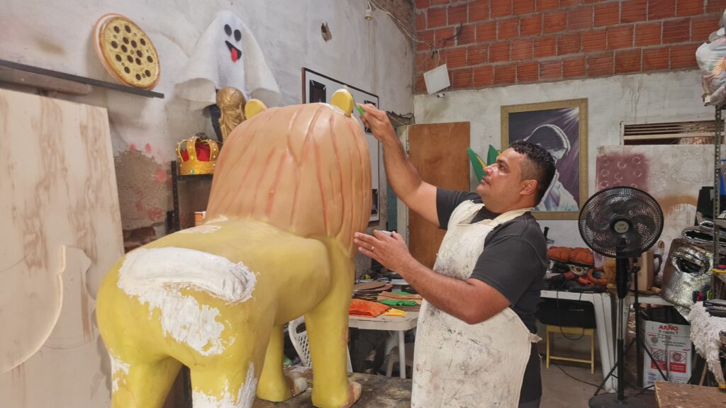 “Eu sempre gostei de artes. Fazia artesanato mesmo só para casa, para família, mas passei a me dedicar mais a partir de 2019, quando fui convidado para participar do espetáculo da primeira Paixão de Cristo. Tem meus trabalhos na confecção de escudos, capacetes, várias outras coisas, cruzes, coroa de espinhos e depois daí não parei mais, foi só crescendo. Graças a Deus. Participei como ator e estou também até hoje”, contou Gil, afirmando que também teve que expandir o trabalho devido à procura, assim passou a fazer trabalhos para grupos juninos e esculturas de animais, personagens e outros objetos para buffets de festas e eventos.