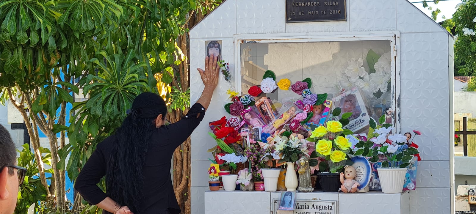 A manicure Janaína Gouveia e a filha Maria Júlia trouxeram uma boneca e colocaram na sepultura de Maria Augusta, uma das mais visitadas ao longo dia. “Minha professora contou a história dela pra gente. Eu combinei com minha mãe pra gente trazer uma boneca. Deu certo. Eu vou ganhar um livro que conta a história dela”, disse a estudante Maria Júlia Gouveia. A mãe dela disse que já tinha ido no cemitério. “A gente já tinha vindo aqui outras vezes. Muito triste a história de menina, que mesmo diante de tanta ameaça e do pai dela, não se entregou. Morreu com toda sua pureza”, acrescentou Janaína.