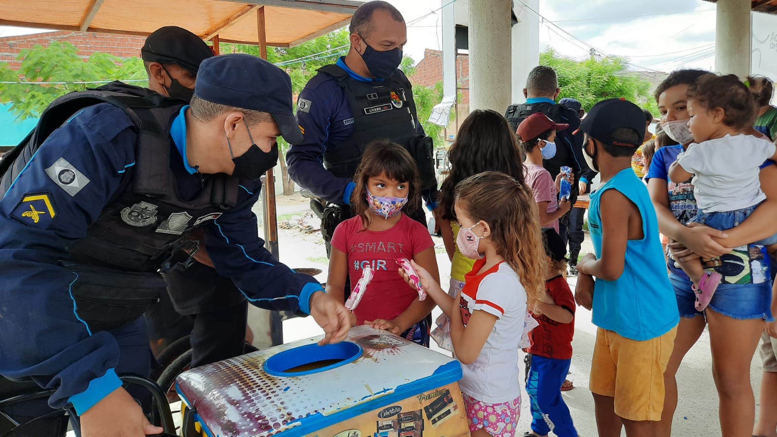 Nesse dia especial teve policial distribuindo algodão-doce, pipoca, picolé, brinquedos e até roupas. “Foi muito bom, porque eles dão brinquedos a quem precisa, dão roupa pra quem não tem”, disse o estudante Eduardo Braúna, 9, criança beneficiada com a boa ação. “É legal porque eles ensinam a gente. Eles fazem nossa segurança e ainda dão brinquedos. Eu me diverti muito”, acrescentou Ana Lívia Ferreira, 10.