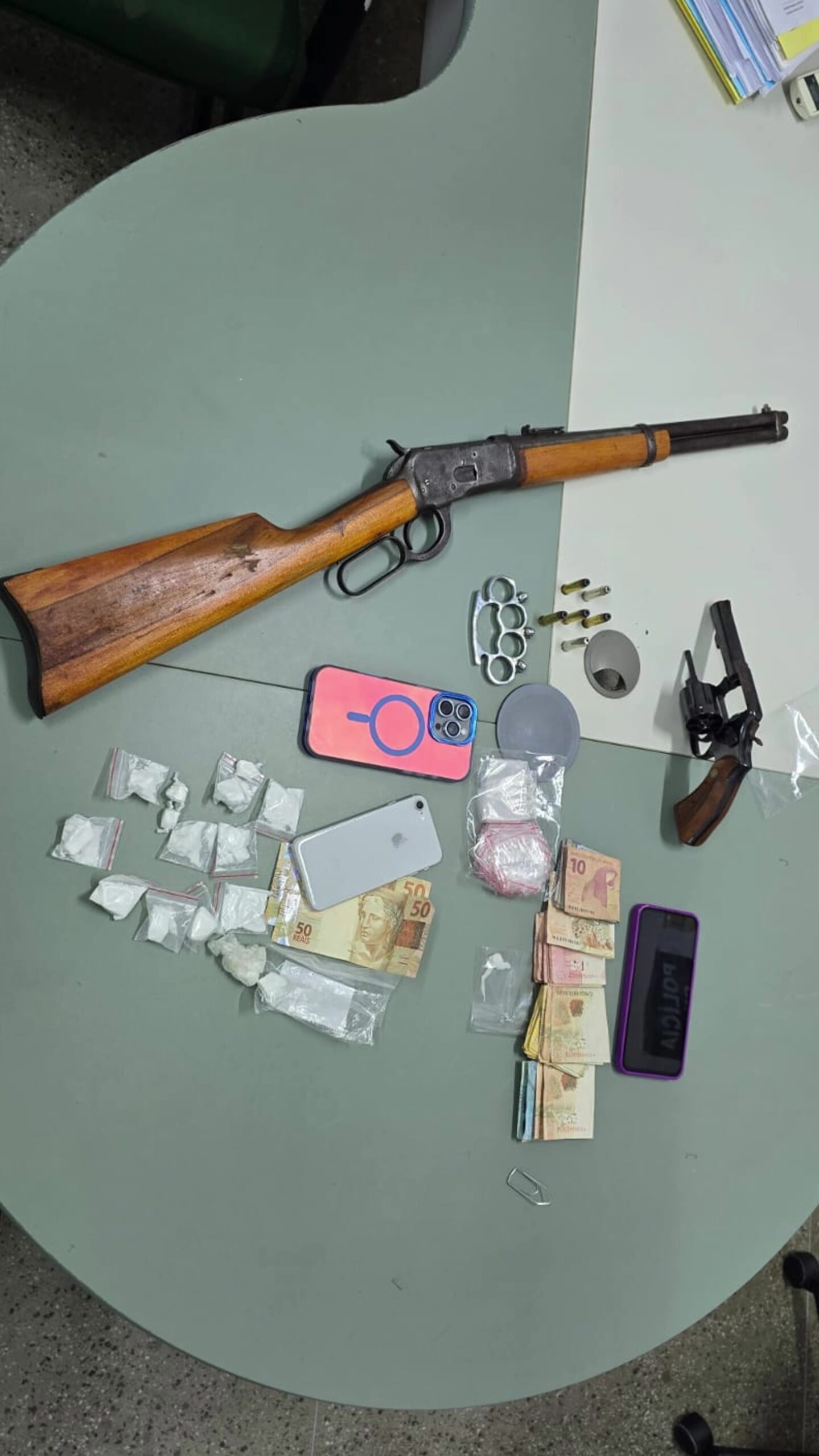 Ainda na mesma região, um terceiro suspeito, de 64 anos, foi preso em flagrante em posse de um arsenal doméstico: um rifle calibre .44, um revólver calibre .38, diversas munições e até um soco inglês. O homem foi autuado por posse irregular de arma de fogo.